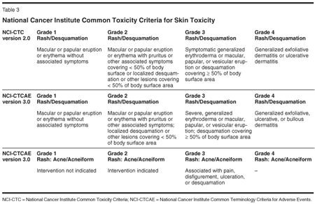 NCI-CTC scales (Table 3) provide various ways to classify a skin rash, adding some complexity to the way this characteristic toxicity is recorded-apart from the obvious subjective bias in classifying the severity of a rash in general. This has to be kept in mind when the results of clinical trials and even the information in package inserts of cetuximab and panitumumab are compared.