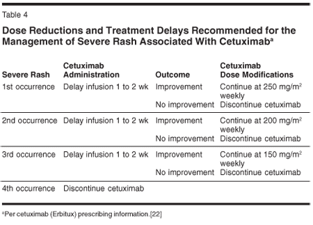 In addition, the current prescribing information for Erbitux recommends specific dose reductions and treatment delays as part of the management of severe rash in patients on cetuximab (Table 4).[22] The package insert for Vectibix calls for withholding the drug for grade 3 and higher dermatologic toxicities or for toxicities that are considered intolerable.[23] If the toxicity does not improve to grade 2 or better, panitumumab should be discontinued permanently. Otherwise, treatment should be resumed at 50% of the original dose of panitumumab, andif toleratedsubsequent doses of the drug can be increased in 25% increments until the original recommended dose of 6 mg/kg every 2 weeks is reached.