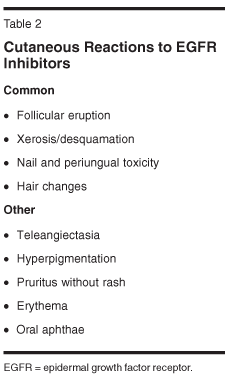 See Table 2 for a list of cutaneous reactions associated with EGFR inhibitors.