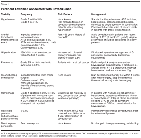 See Table 1 for a list of the most pertinent toxicities associated with bevacizumab administration. In the following sections we will discuss several of these toxicities in detail.