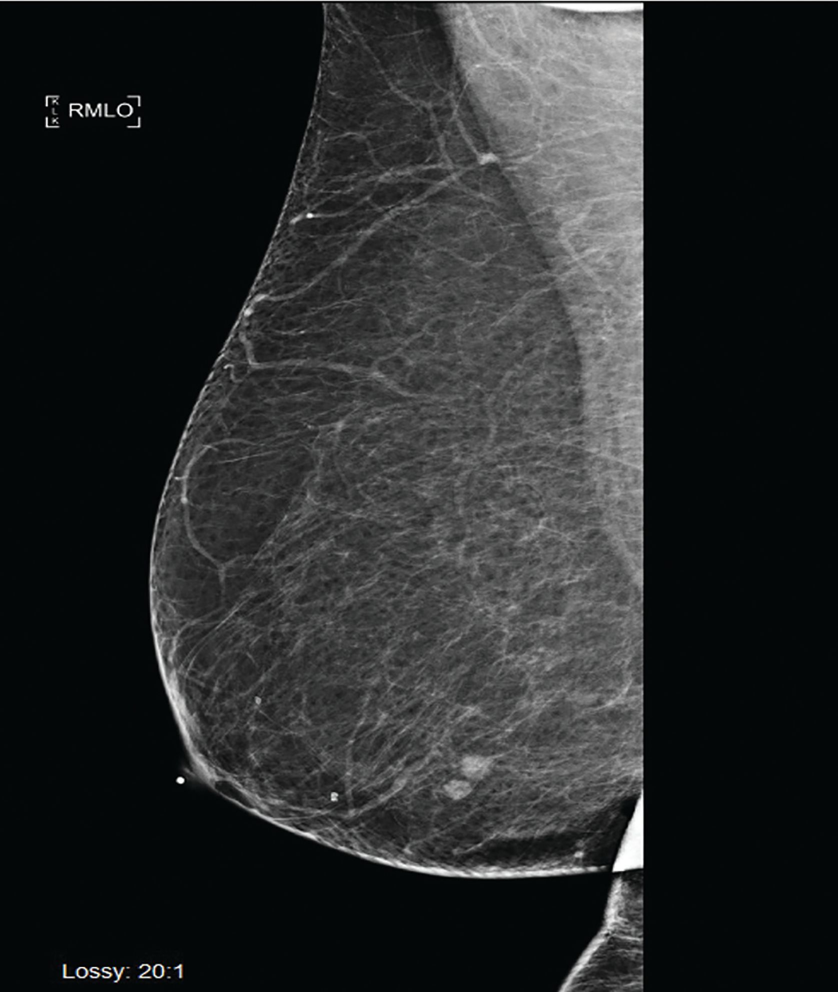 Figure 3. Right mediolateral oblique digital mammogram view shows 2 adjacent nodules in the lower breast. Margins are slightly lobulated. The finding was new from the prior mammogram and suspicious for malignancy.