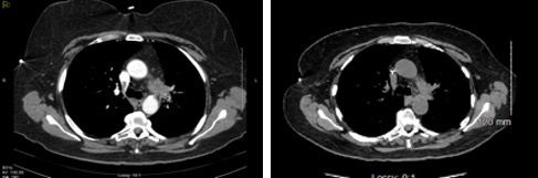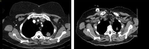 Figure 2. CT scan after treatment shows significant reduction of the left apical pulmonary mass and the left upper hilar nodal mass, consistent with a positive response to chemoradiation.