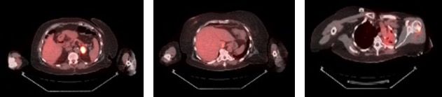 Figure 5. New PET-CT scan. New positive areas of F-18 fluorodeoxyglucose uptake in the left adrenal gland, caudate lobe of the liver, and left humerus. Vague, minimal uptake in the left lung was thought to be pneumonitis.