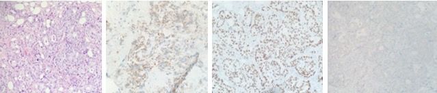 Figure 4. Breast biopsy, invasive adenocarcinoma (hematoxylin and eosin stain). (A); Breast biopsy, invasive adenocarcinoma. Napsin A immunohistochemical stain (cytoplasmic positivity). (B); Breast biopsy, invasive adenocarcinoma. TTF-1 immunohistochemical stain (nuclear positivity). (C); Breast biopsy, Invasive adenocarcinoma. GATA3 immunohistochemical stain (negative). (D).