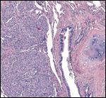 Dr. La Rosa: Figure 3 demonstrates the urothelial metastasis in the lung. The most evident correlation between the urothelial tumors and the presence of this lung metastasis is the presence of tumor invasion into the muscularis propria and lymphovascular invasion as revealed in the urinary bladder specimen. It is difficult to speculate whether the tumors in the renal pelvis and ureter-which did not show evidence of invasion-had anything to do with this metastasis. Nevertheless, the tumors in all specimens, including the lung metastasis, looked very similar and had the characteristics of low-grade urothelial carcinomas; only a molecular analysis could establish differences between them. Some patients with very limited and noninvasive tumors may present with distant metastasis later in life.[8] However, the presence of muscularis propria invasion and lymphovascular invasion in the bladder specimen make the possibility of distant metastasis most likely.