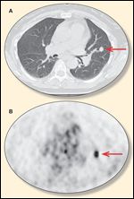 How does metastatic urothelial carcinoma differ in radiologic appearance in the lung vs a primary lung lesion? Dr. Kimi L. Kondo: There is no specific radiologic characteristic that uniquely distinguishes a urothelial metastasis to the lung from a primary lung cancer. Pulmonary metastases tend to present as multiple lesions, although 5% of all solitary lung nodules are metastatic. Metastases typically have sharp margins and are usually located peripherally and in the lung bases; however, primary lung cancers can also have these characteristics. Nodules with increased 18F-fluorodeoxyglucose (FDG) uptake on positron-emission tomography (PET) are usually thought to be malignant, but inflammatory and infectious processes also can have increased FDG uptake. Biopsy and pathologic analysis are needed to distinguish a urothelial metastasis from a primary lung cancer. In our patient, the CT scan of the chest revealed a nodule with a corresponding hypermetabolic lesion on the FDG-PET scan (Figures 2A, 2B).