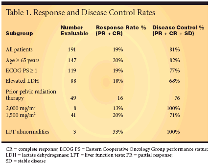 twice daily on days 1 to14 every 21 days. The median numberof cycles was five. Prior pelvic radiationtherapy required dose reductionto 750 mg/m