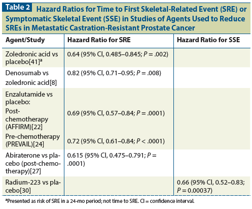 Table 2: Hazard Ratios for Time to First Skeletal-Related Event (SRE) or Symptomatic Skeletal Event (SSE) in Studies of Agents Used to Reduce SREs in Metastatic Castration-Resistant Prostate Cancer