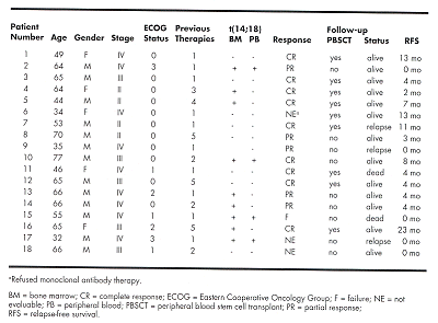Patients included (see table for details) 13 males and 5 females, with a mean age of 52.3 ± 13.4 years (range: 32 to 77 years), and ECOG status of 0 (11 patients), 1 (3), 2 (2), or 3 (2). Clinical stage was determined to be II (4 patients), III (5), or IV (9), with 1 (10 patients), 2 (3), or ³ 3 (5) previous therapies. Before therapy, bone marrow showed positive PCR t(14;18) in 10 cases (55.5%), and 4 (22.22%) were positive in peripheral blood.