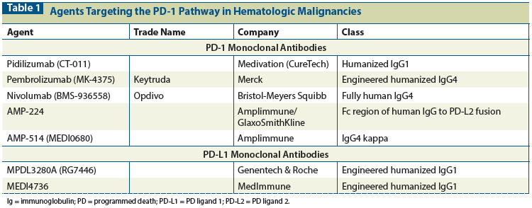 Table 1: Agents Targeting the PD-1 Pathway in Hematologic Malignancies