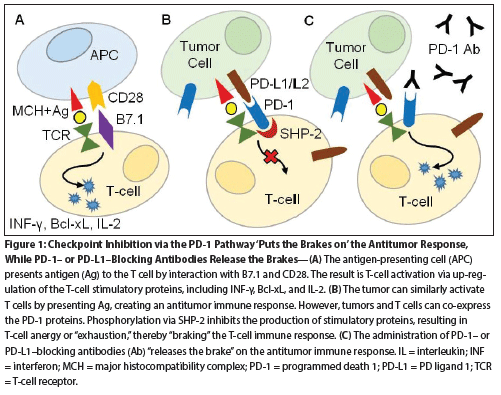 One such immune checkpoint is the PD-1 pathway. The PD-1 protein was first described in the early 1990s and was initially thought to play a role in programmed cell death or apoptosis.[3] Further investigation, however, revealed a role in manipulation of T-cell subsets. Ultimately, the PD-1 pathway was found to play a role in regulation of T-cell activation and in apoptotic pathways of effector/memory T lymphocytes. Binding of the PD-1 receptor with PD-L1 interferes with T-cell receptor signaling and blocks phosphatidylinositol 3-kinase (PI3K) activation. Blocking of PI3K activation leads to down-regulation of stimulatory proteins required for T-cell proliferation.[4,5] Checkpoint inhibition via the PD-1 pathway suppresses the antitumor response (Figure 1). The PD-1 pathway has been adapted by multiple pathologic processes-including chronic infections such as HIV, hepatitis, and parasitic infections-and autoimmune diseases such as rheumatoid arthritis, inflammatory bowel disease, and diabetes mellitus type 1.[6-9] Co-optation of the PD-1 pathway by malignant cells was first described in the early 2000s, leading to investigations into PD-1 blockade as a possible mechanism for cancer therapy.[10,11]