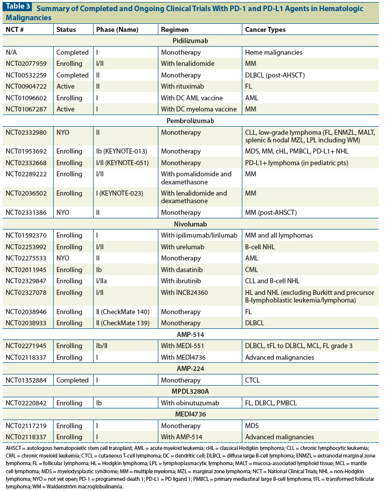 Table 3: Summary of Completed and Ongoing Clinical Trials With PD-1 and PD-L1 Agents in Hematologic Malignancies