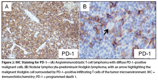 PD-1 pathway expression markers, including PD-1, PD-L1, and PD-L2, have been confirmed in multiple hematologic malignancies. Marker expression is characterized by immunohistochemistry (IHC) and can be present either on tumor cells or on the infiltrating lymphocytes within the surrounding tumor microenvironment (Figure 2). Evidence for the PD-1 pathway, as demonstrated by IHC, has been found in multiple myeloma, acute myeloid leukemia, Hodgkin lymphoma, and the non-Hodgkin lymphomas, including both B-cell and T-cell subtypes.[12-15] PD-1 marker expression in non-Hodgkin lymphomas has been described in chronic lymphocytic leukemia/small lymphocytic lymphoma, follicular lymphoma, diffuse large B-cell lymphoma (DLBCL), primary mediastinal B-cell lymphoma, anaplastic large-cell lymphoma, and angioimmunoblastic T-cell lymphoma.[13,16-18] There is heterogeneity of PD-1 marker expression even within specific lymphoma subtypes.