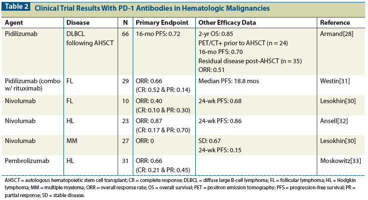 Table 2: Clinical Trial Results With PD-1 Antibodies in Hematologic Malignancies