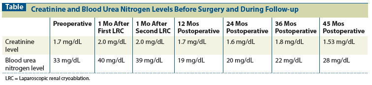Treatment options were discussed with the patient, who opted for ablative therapy. Ultimately, bilateral staged renal cryoablation was the treatment option elected by the patient. Laparoscopic renal cryoablation (LRC) was performed on the right side (for the larger tumor) and then on the left side 1 month after initial therapy. The comparison between preoperative and 6 months’ postoperative creatinine and blood urea nitrogen levels is shown in the Table. Laparoendoscopic single-site cryoablation was performed with two cycles of freeze and thaw, and biopsies of the lesions were performed between the first and second freeze cycles, without compromising histologic evaluation, as described in our previous studies.[1] Blood loss during the procedure was minimal (< 50 mL for each procedure) and no complications were reported. The patient had 1 day of hospitalization for each treatment. Pathologic evaluation of the right-side biopsy specimens revealed papillary RCC. On the left side, clear-cell RCC with a Fuhrman nuclear grade of 2 was identified.
