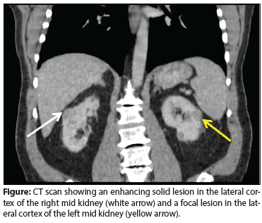 Figure: CT scan showing an enhancing solid lesion in the lateral cortex of the right mid kidney (white arrow) and a focal lesion in the lateral cortex of the left mid kidney (yellow arrow).