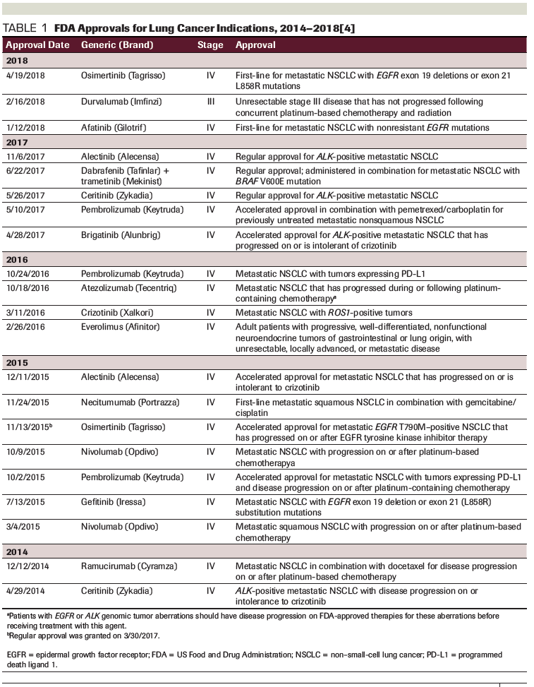Table 1. FDA Approvals for Lung Cancer Indications, 2014–2018