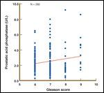 Investigators have reported only a weak relationship between PSA/Gleason score and PAP.[46] Zagars calculated the correlation coefficient between PSA and PAP to be only 0.35.[47] Dattoli found the correlation coefficient between Gleason score and PAP to be only 0.34 (Figure 6).[41,48] This suggests that there is the potential to garner unique information from each. In particular, there will be many patients who are classified as moderate to high risk by PSA and Gleason for whom PAP levels may be able to more accurately stratify risk categories.