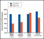 In contrast to PAP's inferiority in staging and posttreatment monitoring functions, an elevated pretreatment PAP has consistently been identified as a significant prognostic factor.[17,30,31] In the PSA era, Walter Reed investigators studied 295 higher-risk prostatectomy patients. Those with an elevated preprostatectomy PAP had only a 39% 4-year biochemical disease-free survival vs 79% for patients with a normal PAP. Patients with elevated PAP had significantly lower disease-free survival across all PSA levels.[32] Johns Hopkins investigators reviewed 1,600 patients and also identified pretreatment PAP as an independent prognostic factor, with a hazard ratio for biochemical failure similar to that of PSA.[33] The only recent surgical series that did not identify PAP as a predictor of cancer recurrence was one from Beth Israel Deaconess (Figure 2).[34] However, their negative finding was in a homogeneously low-risk population of 180 patients with very few recurrences.