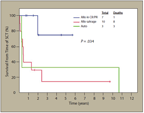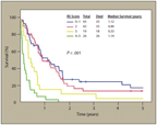 Patients were divided into low-, low-intermediate–, high-intermediate–, and high-risk categories based on the number of risk factors at the time of presentation (identified by scores of 0–1, 2, 3, and 4–5, respectively). Median survival of patients in low-, low-intermediate–, high-intermediate–, and high-risk categories was 1.12, 0.9, 0.33, and 0.2 years, respectively (Figure 2).