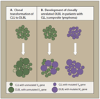Diffuse large B-cell lymphoma that develops in patients with Richter's transformation can be either clonally related or unrelated to the original CLL clone. Clonally related Richter's transformation and clonally unrelated Richter's transformation differ in many respects-and clonally unrelated Richter's transformation is also different from de novo diffuse large B-cell lymphoma. Figure 1 depicts the outline of the development of clonally related/unrelated diffuse large B-cell lymphoma in patients with CLL.[17] Immunoglobulin heavy chain (IGHV) gene sequencing by polymerase chain reaction (PCR) is useful in determining the clonality in patients with Richter's transformation.[10] Clonally unrelated Richter's transformations have a lower prevalence of TP53 disruption, stereotyped VH CDR3, and a higher prevalence of mutated IGHV. Patients with clonally unrelated Richter's transformation have a longer survival than patients with clonally related diffuse large B-cell lymphoma (true Richter's transformation).[11]