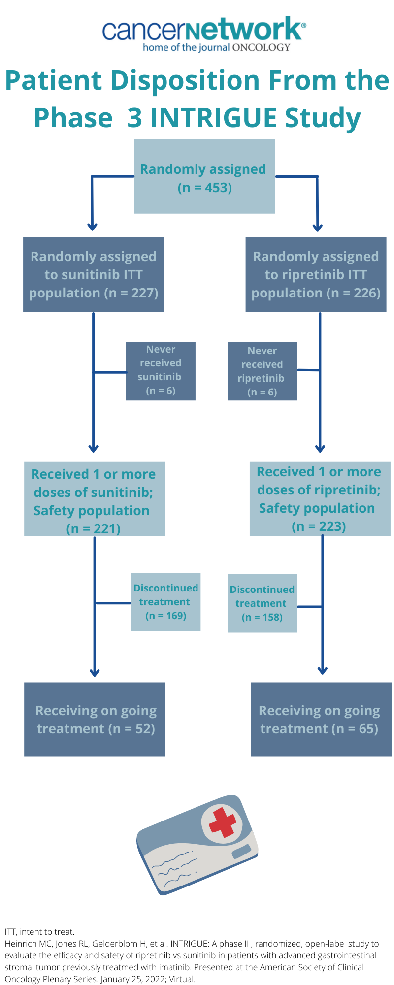 1. Heinrich M, Jones R, Gelderblom H, et al. INTRIGUE: A phase III, randomized, open-label study to evaluate the efficacy and safety or ripretinib vs sunitinib in patients with advanced gastrointestinal stromal tumor previously treated with imatinib. Presented at: ASCO Plenary Series; January 25, 2022. https://bit.ly/3rSL8X4