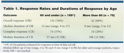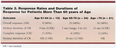 Twenty-one patients were older than 70 years. For that subset, overall response was 48% (14% complete response rate), with a median duration of response of 11 months.