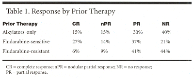 Using National Cancer Institute (NCI) criteria, Dr. Garcia-Manero reported 28 (21%) complete responses (CR), 18 (13%) nodular partial responses (nPR), and 50 (37%) partial responses (PR), for an overall response rate (ORR) of 71%. Five of 14 patients (35%) who had immunoglobulin rearrangements detectable by polymerase chain reaction (PCR) assay at study entry had molecular complete responses (PCR negative) after treatment. Responses varied depending on prior therapy (see Table 1).