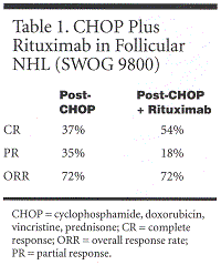 David G. Maloney, MD, PhD, reported on behalf of the Southwest Oncology Group (SWOG) that treating advanced-stage follicular lymphoma with a cycle of rituximab after standard CHOP (cyclophosphamide [Cytoxan, Neosar], doxorubicin HCl, vincristine [Oncovin], prednisone) significantly improved the quality of responses in 19% of patients, and brought the complete response rate to 54%.