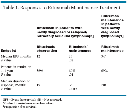 A total of 151 patients were randomized to rituximab maintenance or observation. The patient and baseline disease characteristics for the two treatment groups were well balanced. Median age was 57 years; 97% of patients had a performance status of 0 or 1; 85% had stage III or IV disease; 52% had bone marrow involvement; 30% had elevated levels of lactate dehydrogenase; and 18% had received prior radiation therapy. After a median follow-up of 35 months, the median event-free survival was 23 months for the rituximab maintenance group and 12 months for the observation group (P = .02) (see Table 1).[1,3] This difference was more pronounced for patients who were chemotherapy naive (36 months vs 19 months for observation only; P = .009). The majority of patients (80%) in the maintenance group were still in remission compared with 56% of those in the observation group (P = .01). Thirty-four patients in this study improved the quality of their response, with the complete response rate increasing from 10% to 29%. Circulating B-cell counts returned to within 65% of baseline in patients in the observation group compared with 33% for those in the rituximab maintenance group (P = .04). Immunoglobulin G, A, and M levels remained stable in the plasma of patients in the observation arm, while the Ig M level was significantly lowered in the maintenance arm, and infectious complications were rare and similar for both treatment groups. In summary, the addition of rituximab maintenance therapy at 2- month intervals reduced the risk of relapse by 55% for responding patients and significantly improved the remission rate at 1 year with no additional toxicity. The authors concluded that this randomized study confirms the efficacy of maintenance rituximab in patients with follicular lymphoma. Results Corroborated Another study showing the benefits of maintenance therapy for delaying or preventing relapse in rituximab- sensitive patients was recently published in the Journal of Clinical Oncology. In that study, John Hainsworth, MD, of the Sarah Cannon Cancer Center in Nashville, Tennessee, and others reported results of a 6-month rituximab maintenance regimen in patients with newly diagnosed follicular small cleaved, follicular mixed, or small lymphocytic lymphoma.[ 1]