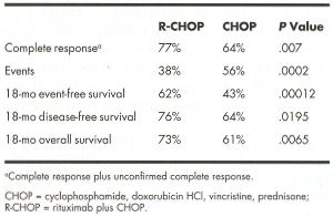 At the 2000 Annual Meeting of the American Society of Hematology, we presented the benefits of rituximab (Rituxan) combined with CHOP (cyclophosphamide [Cytoxan, Neosar], doxorubicin HCl, vincristine [Oncovin], prednisone), known as R-CHOP, in comparison with CHOP alone for the treatment of elderly patients with diffuse large B-cell lymphoma (DLCL).