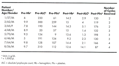 Eight CLL patients with Coombs-positive AIHA, who had failedsteroid therapy, were treated between December 1998 and March 2000. Thetreatment regimen consisted of rituximab (Rituxan) given at a dose of 375 mg/m2IV infusion on day 1, cyclophosphamide (Cytoxan, Neosar) at a dose of 750 to1,000 mg/m2 IV on day 2, and dexamethasone at 12 mg/d IV on days 1 and 2 andorally from days 3 to 7. This treatment was repeated monthly for 4 months, or itwas stopped sooner if a maximally achievable beneficial response was reached.The table below provides the pre- and posttreatment absolute lymphocyte count(ALC) × 1,000/µL, hemoglobin (Hb) in g/dL, and platelets × 1,000/µL: