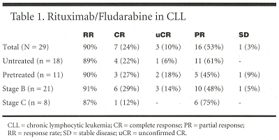 The report included 29 patients treated with fludarabine at 25 mg/m²/d (on days 1-5, 29-33, 57-61, 85-89). The first two infusions of rituximab were given together with fludarabine on days 57 and 85, while the following doses (375 mg/m²) were given on days 113 and 151. Eighteen patients were previously untreated, and 11 had previous chlorambucil/prednisone. Twenty-one patients had stage B disease, and 8 had stage C.