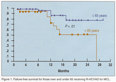 Kaplan-Meier curves comparing failure-free survival found no statistically significant differences among those 65 years old or younger who received R-HCVAD compared to a similar age group receiving hyper-CVAD followed by stem cell transplant, or among patients older than 65 who received R-HCVAD compared to a similar group who received hyper-CVAD without rituximab.