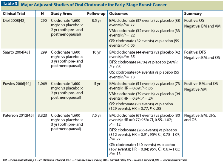 45. Paterson AH, Anderson SJ, Lembersky BC, et al. Oral clodronate for adjuvant treatment of operable breast cancer (National Surgical Adjuvant Breast and Bowel Project protocol B-34): a multicentre, placebo-controlled, randomised trial. Lancet Oncol. 2012;13:734-42.