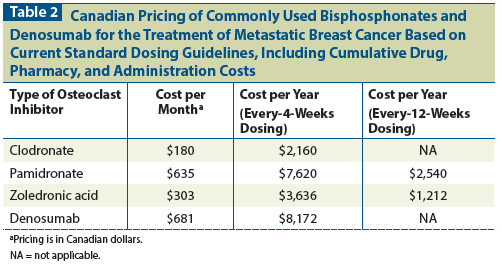 Table 2: Canadian Pricing of Commonly Used Bisphosphonates and Denosumab for the Treatment of Metastatic Breast Cancer Based on Current Standard Dosing Guidelines, Including Cumulative Drug, Pharmacy, and Administration Costs