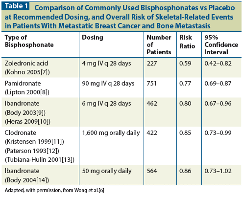 Table 1: Comparison of Commonly Used Bisphosphonates vs Placebo at Recommended Dosing, and Overall Risk of Skeletal-Related Events in Patients With Metastatic Breast Cancer and Bone Metastasis