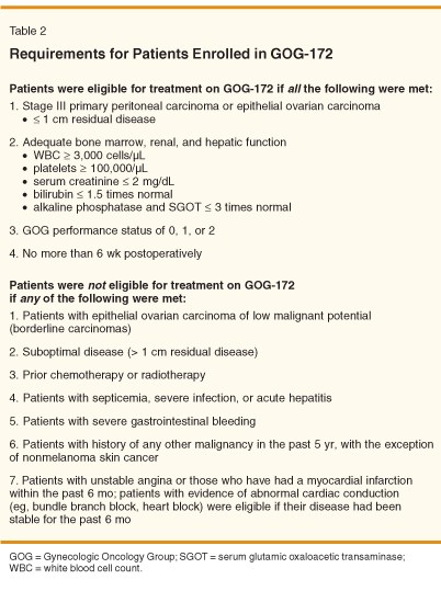 Additionally, all clinical research is plagued with the efficacy vs effectiveness dilemma. Clinical trials are designed to demonstrate efficacy, or whether a treatment can work. Despite the best efforts to provide diversity, patients who participate in clinical trials tend to be a highly selected and homogeneous population. Therefore, the information obtained in clinical trials may not be applicable to individuals who vary from the study population. Effectiveness, on the other hand, is demonstrated by results in the general population outside of a clinical trial. Trials of intraperitoneal therapy for ovarian cancer are no exception to this dilemma. SWOG-8501/GOG-104,[2] GOG-114,[3] and GOG-172[1] tested IP therapy in relatively homogeneous populations. The eligibility criteria for GOG-172 are presented in Table 2. As the IP strategy is used to treat patients who significantly deviate from these requirements, the effectiveness of such therapy may be compromised.