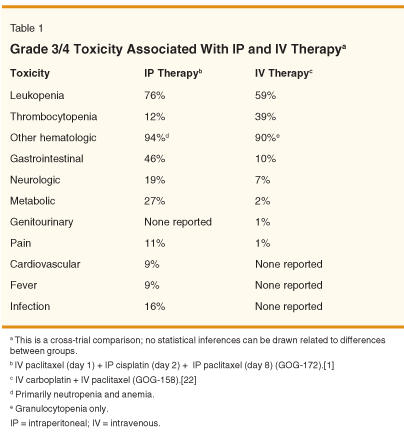 IP therapy also produces a different toxicity profile than the current IV carboplatin-plus-paclitaxel regimen (Table 1). Each of these toxicities is manageable and short-term in nature. Current and planned research is largely focused on reducing the toxicities associated with the GOG-172 IP treatment regimen to improve acceptability and to increase the proportion of patients who are able to complete the full course of treatment.[21]