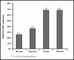 After 6 weeks of therapy, there were significant increases in Hgb levels in all treatment groups in the intent-to-treat analysis (P < .001), with a clear greater benefit in the IV bolus and TDI groups (both P < .05 vs no iron and oral iron). Treatment group differences in Hgb response appeared to be independent of the pretreatment TSAT (< 15% vs ≥ 15%). Furthermore, there was a hematopoietic response (defined as an increase of ≥ 2g/dL in the Hgb level or an Hgb level ≥ 12 g/dL in the absence of red blood cell transfusions during the study) in significantly more patients treated with IV bolus or TDI iron than in those treated with no iron or oral iron (P < .01; Figure 1). There was also a trend toward a greater response in patients with a pretreatment ferritin level of less than 100 ng/mL than in those with a level of 100 ng/mL or higher.