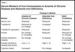 A number of markers of iron homeostasis can be used to differentiate between anemia of chronic disease and absolute iron deficiency (Table 1).[2,19-21] In a population of patients with anemia of any cause, a serum ferritin level of 100 ng/mL or less was the most sensitive and specific marker of iron deficiency. Total iron-binding capacity and TSAT were less able to differentiate between iron deficiency and iron sufficiency.[19] Furthermore, because serum ferritin levels reflect the stored iron component and soluble transferrin receptor (sTfR) levels reflect the available iron component, the sTfR/log ferritin index makes it possible to differentiate iron deficiency into iron-depleted and iron-sufficient functional iron deficiency states. The correlation between this index and the hemoglobinization of red blood cells makes it possible to map the progression of iron deficiency.[20]