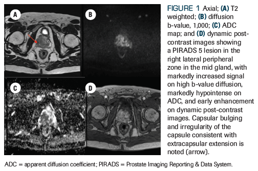 Figure 1. Images Showing a PIRADS 5 Lesion in the Right Lateral Peripheral Zone in the Mid Gland