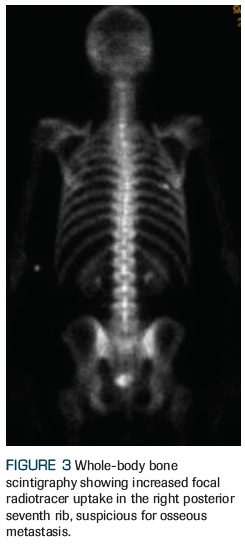 An otherwise healthy 59-year-old man who was recently diagnosed with American Joint Committee on Cancer (AJCC) 8th edition clinical stage IVB (T3aN1M1b) prostate adenocarcinoma presents to the radiation oncology clinic for consideration of radiation therapy. After he was found to have an elevated prostate-specific antigen (PSA) level of 16.7 ng/mL, he underwent a standard transrectal ultrasound–guided biopsy that revealed a prognostic grade group 4 (Gleason score 4+4) in 7 of 12 core biopsies, with lower-grade adenocarcinoma present in the remaining 5 core biopsies. A multiparametric prostate MRI revealed a large (4 cm) Prostate Imaging Reporting and Data System (PIRADS) 5 lesion with extracapsular extension, as well as pelvic lymphadenopathy, including a 2.2-cm left internal iliac node (Figures 1 and 2). A staging bone scan showed focal uptake in the seventh right rib (Figure 3), corresponding to a sclerotic lesion on follow-up CT, which was deemed highly suspicious for an isolated focus of metastatic prostate cancer after careful review in multidisciplinary conference. He was started on upfront systemic therapy with leuprolide, abiraterone acetate, and prednisone. Three months later, his PSA level had decreased to 0.03 ng/mL, and 1 month after that, imaging showed a mixed response to systemic therapy with reduced bilateral pelvic lymphadenopathy and persistent focal uptake in the seventh right rib metastatic lesion. No new lesions were identified.