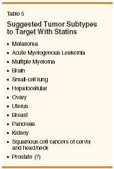 The relationship between cancer and coagulation activation has long been known, and the use of anticoagulant drugs for prevention and treatment of thrombosis in cancer patients is commonplace. It is not well appreciated, however, that anticoagulants have anticancer activity, especially in certain tumor types such as melanoma and small-cell lung cancer (reviewed in [87,88]). Numerous studies have shown that statins have antithrombotic activity, and it may be this characteristic of the drugs, rather than their lipid-lowering properties, that accounts for their efficacy in preventing cardiovascular, cerebrovascular, and venous thrombosis (reviewed in [89,90]). In particular, statins decrease the expression of tissue factor, a cell surface protein that is essential for the initiation of coagulation reactions and the synthesis of thrombin. Thrombin, although originally described as a coagulation protein, is a potent growth factor for melanoma (reviewed in [87]). Tissue factor is commonly expressed aberrantly on the surface of melanoma cells and leads to thrombin production in the immediate vicinity of tumors. Rho proteins perform key functions in regulating thrombin activity, and inhibition of Rho isoprenylation is one mechanism by which statins exert antithrombotic activity.[91-95] In our laboratory, lovastatin decreased the expression of melanomaassociated tissue factor and tumor cell proliferation in cultured human melanoma cells.[69] Others have shown that lovastatin combined with chemotherapy had a synergistic effect on tumor growth inhibition in a mouse melanoma model.[59,96] Atorvastatin inhibited RhoC signaling in human melanoma cell lines in vitro and reduced the number of experimental melanoma metastases in vivo in a recent study.[70] We believe that one mechanism by which statins may hinder melanoma growth and metastasis is by inhibiting Rho protein isoprenylation, which, in turn, results in diminished thrombin activity. Which Tumors Are Likely Targets for Statins? Targeting posttranslational isoprenylation pathways with statin drugs is a novel approach to cancer treatment deserving of additional investigation. As is usually the case in clinical oncology, however, this approach is likely to be useful in some tumor types but not others, due to variations in tumor biology. For example, in transgenic mouse models, lovastatin suppressed the development of mammary but not prostate tumors, suggesting that the drug might have a role for chemoprevention of breast but not prostate cancer.[97] Based on available preclinical and clinical data, a list of tumor types against which statins may have activity and in which they should be tested further is presented in Table 5. In particular, we believe that tumor types in which coagulation pathways play an important role in tumor progression (such as melanoma, AML, pancreatic, kidney, and small-cell lung cancers)[ 88] provide unique opportunities for studying statin-associated anticancer activity, since they present the potential to target multiple pathways of tumor growth with a single agent. The Future of Statins for Cancer TreatmentLikely Settings for Statin Therapy