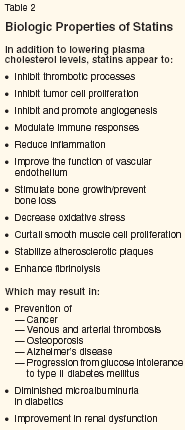 HMG-CoA reductase inhibitors (or "statins") are US Food and Drug Administration (FDA)- approved for treating hypercholesteremia. Members of this drug class currently available in North America are listed in Table 1.[1,2] Statins produce reductions in low-density lipoprotein (LDL) cholesterol of up to 60% by inhibiting the rate-limiting step in hepatic cholesterol biosynthesis and have been shown to decrease cardiovascular morbidity and mortality in both primary and secondary prevention studies (reviewed in [3]). Beyond lipid-lowering, however, the statins have effects on numerous other biologic pathways, suggesting that they may be useful for treating conditions other than cardiovascular disease (reviewed in [4-6]). For example, statins have antithrombotic and anti-inflammatory activity that may account for their apparent ability to decrease the risk of venous thromboembolism and ischemic stroke, prevent osteoporosis, and retard the progression of multiple sclerosis. In addition, they are generating much interest in their anticancer activity, which is the subject of this review. The pleiotropic activities of statins are summarized in Table 2.[1,5,7-14] General Information Over 76 million prescriptions for statins were filled in the United States in 2000, making statins the most widely prescribed drug class for lowering cholesterol and among the most widely prescribed of all drug classes. While they all competitively inhibit the enzyme HMG-CoA reductase, the six statins currently available in North America differ in their synthesis, structure, potency, metabolism, and pharmacokinetic and pharmacodynamic properties (Table 1). These dissimilarities may account for the observation that the individual drugs seem to have disparate anticancer activities.[15,16] Biochemistry