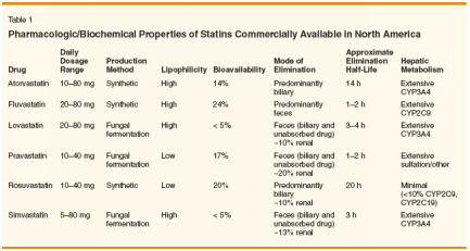 The pharmacology of HMG CoA reductase inhibitors has been reviewed in detail recently.[1] The statins are orally administered and are variably absorbed from the gastrointestinal tract with bioavailabilities ranging from < 5% (lovastatin, simvastatin)to 25% (fluvastatin). The statins concentrate in the liver, where they reduce hepatic cholesterol synthesis, resulting in upregulation of hepatic LDL receptors, which in turn results in increased clearance of LDL cholesterol from plasma. Since statins concentrate in the liver, little drug circulates in plasma and that which does circulate is highly protein bound. Except for rosuvastatin, the statins are extensively metabolized in the liver to active (atorvastatin, lovastatin, simvastatin) or inactive (fluvastatin, pravastatin) metabolites. All statins are eliminated predominantly by biliary excretion into feces; however, the elimination half-lives vary considerably (Table 1). The statins differ in their solubility properties; pravastatin and rosuvastatin are hydrophilic, whereas the remaining members of the class are lipophilic. Pravastatin is unique among the statins in that it is not metabolized by the cytochrome P450 system and hence has fewer potential medication interactions than other members of the class. Toxicity