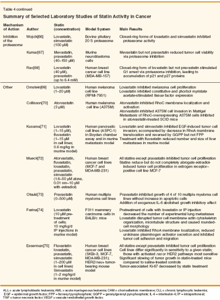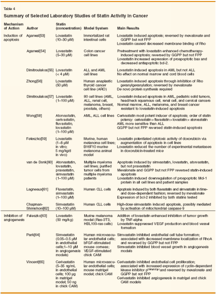 Although these drugs are safe in the overwhelming majority of people who take them for lipid-lowering purposes, there are unique issues in cancer patients that may predispose them to untoward toxicity. For example, involvement of the liver with tumor metastases may provoke or exacerbate statin-mediated hepatic injury. Medications that interfere with statin metabolism by cytochrome P450 enzyme pathways, such as erythromycin, azole antifungal agents, and cyclosporine are commonly prescribed to cancer patients and may increase the risk of myopathy or rhabdomyolysis. Care must therefore be taken when combining statins with other drugs, especially chemotherapy agents that might inhibit their clearance by CYP450 enzymes. Ubiquinone has been reported to prevent statin-associated myopathy, but its use in conjunction with statins in cancer patients is yet to be defined. Moreover, although ubiquinone does not appear to interfere with statin-mediated anticancer activity in laboratory models,[103] whether this is the case in humans is not known. Conclusions The statins have been available in the United States for the treatment of hyperlipidemia for nearly 2 decades, but only recently has it been appreciated that these agents have multiple attributes that may be exploited for other purposes including cancer prevention, cancer treatment, and supportive care of oncology patients. A wealth of laboratory data has provided us with plausible mechanisms of action to explain their anticancer effect, and it is now time to accelerate their testing in appropriately designed, hypothesis-driven prospective clinical trials.