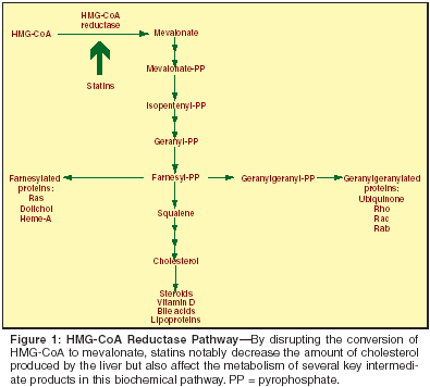 Lovastatin, a mevinic acid derivative produced by fermentation of Aspergillus terreus, was the first statin marketed in the United States for cholesterol-lowering. Pravastatin (Pravachol) and simvastatin (Zocor) are the two other fungal-derived, "natural" statins. Fluvastatin (Lescol) was the first entirely synthetic statin and has been followed by atorvastatin (Lipitor), cerivastatin, and rosuvastatin (Crestor). Cerivastatin has been voluntarily removed from the US market because of its association with a higher than expected number of fatal cases of rhabdomyolysis. All statins are competitive inhibitors of HMG-CoA reductase to prevent the conversion of HMG-CoA to mevalonate (Figure 1). Disruption of this step results in an overall decrease in the amount of cholesterol produced by the liver and, therefore, a lowering of plasma cholesterol levels. Although cholesterol is the most widely studied product, several key intermediate products of this biochemical pathway are also affected by statins. It is the inhibition of these intermediates that accounts for the panoply of biologic effects that statins have beyond cholesterol reduction.