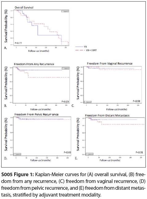 Results: Median patient age was 61 years (range: 30–87 yr). All tumors had endometrioid histology. There were 30 grade 1 tumors, 20 grade 2 tumors, and 12 grade 3 tumors. For all patients, the 5-year overall survival was 75.4%, and the 5-year recurrence-free survival was 89%. There was no statistically significant difference in overall survival (P = .770) or freedom from vaginal (P = .981), pelvic (P = .834), distant (P = .307), or any recurrence (P = .230) with respect to modality of treatment (EBRT + VB vs VB alone) (Figure). In the multivariate analysis, the only risk factor influencing overall survival was patient age (P = .033). Four patients experienced a toxicity requiring hospital admission, and all of these patients were treated with pelvic external beam plus brachytherapy.