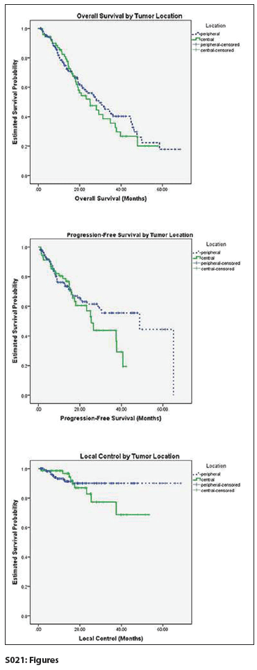 Methods: Patients with primary NSCLC treated with SBRT at Yale-New Haven Hospital from 2007 to 2013 were included in this analysis. Central tumor location was defined as within 2 cm of the proximal bronchial tree, heart, great vessels, trachea, or other mediastinal structures. Acute toxicity was defined as occurring within 3 months of treatment, and late toxicity was defined as occurring after at least 3 months of treatment. Toxicity was defined as “severe” if graded as 3 or higher. The association of tumor location with overall survival (OS), progression-free survival (PFS), and local control (LC) was assessed with Kaplan-Meier analysis and Cox regression modeling. For evaluation of toxicity, chi-square analysis and logistic regression modeling were used. Multivariate analyses adjusted for potential covariates, including age, sex, BED, performance status, clinical versus pathologic diagnostic method, tumor histology, tumor size, and total number of targets.